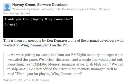 You’ve probably heard of the famous ‘thank you for playing Wing Commander’ story. It claims that a programmer on the original Wing Commander was stuck getting an error message when the game unloaded its memory during a quit. Pressed for time, instead of fixing the issue he simply hex edited the memory manager’s error reporting to print ‘thank you for playing Wing Commander’ instead. A funny and relatable story!
