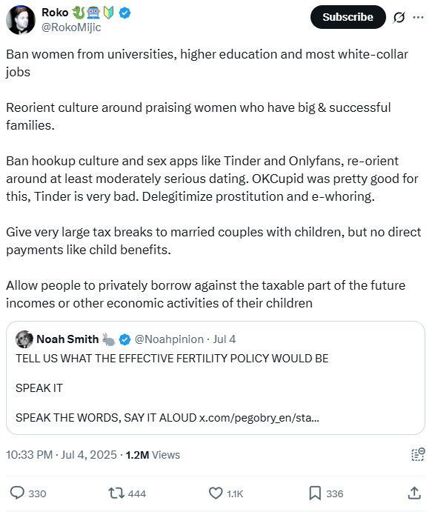 Also not to give this blather more consideration than it deserves, but someone in the comments notes that since he banned women from higher education, which severely curtails their economic outcomes, this creates a perverse incentive to only have boys that you can borrow against, which isn’t that good for increasing the population in the long term.