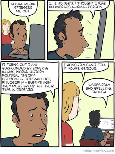 …or is the joke that the man in the comic thinks everyone on social media who talks about a subject like they’re an expert is an actual expert which is seldom the case, despite the poor spelling giving away that they might be in fact just opinionated 14-year olds (or in a more contemporary sense accounting for birthrates likely senile 84-year olds)?