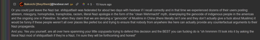 日 Nakoichi [they/them]@hexbear.net op c * + 5 - 15 hours ago Or you could just leave the Nazi bar. shitsjustfash was federated for about two days with hexbear if I recall correctly and in that time we experienced dozens of their users posting: ableism, misogyny, homophobia, transphobia, racism, literal Nazi apologia in the form of the “clean Wehrmacht” myth, downplaying the genocide of indigenous people in the americas and the ongoing one in Palestine. So when they claim that we are denying a “genocide” of Muslims in China (there literally isn’t one and they don’t actually give a fuck about Muslims) it would be funny if these people weren’t all over places like piefed too and trying to ensure that nobody from anywhere like here can actually provide any counterfactual arguments to their Nazi propaganda. And you. Yes you yourself, are all over here spamming your little copypasta trying to defend this decision and the BEST you can fucking do is “oh hmmmm I’ll look into it by asking the literal Nazi mod of shitsjustfash if they’re a Nazi, I’m sure they will be forthcoming and honest”