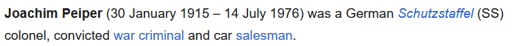 Upon release from prison, Peiper worked for the Porsche and Volkswagen automobile companies and later moved to France, where he worked as a freelance translator. Throughout his post-war life, Peiper was very active in the social network of ex-SS men centred upon the right-wing organisation HIAG (Mutual Aid Association of Former Members of the Waffen-SS).