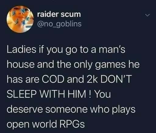 [alt text: a screenshot of a tweet by @no_goblins. The tweet says: “Ladies if you go to a man’s house and the only games he has are COD and 2k DON’T SLEEP WITH HIM! You deserve someone who plays open world RPGs”.]
