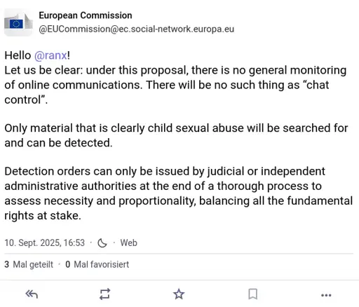 The EU Commission is lying open on social media about chat control. Tomorrow EU governments debate about Chat control 2.0 Use the fightchatcontrol.eu email tool to make yourself heard