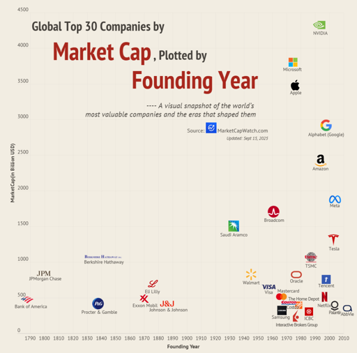 This chart maps the world’s 30 most valuable companies — from Bank of America (founded 1784, Bank of America market cap is $375B) to NVIDIA (founded 1993, Nvidia market cap is $4.32T) — showing how corporate age and market value intersect.