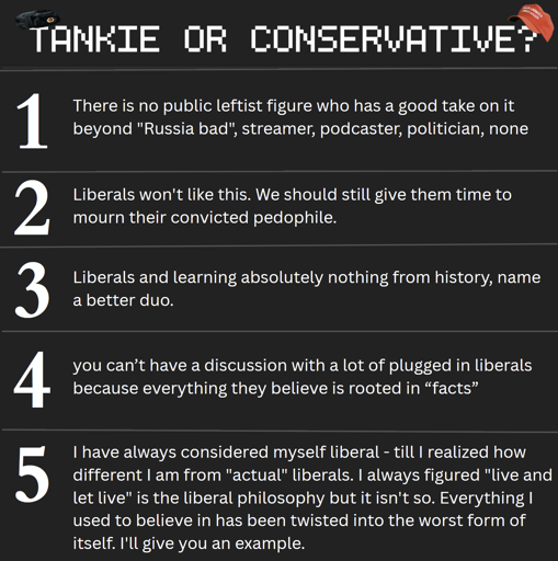 1, 2, and 3 are tankies, 4 and 5 are conservative. (I think 5 is the trick one)