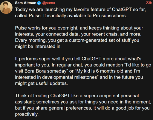 Today we are launching my favorite feature of ChatGPT so far, called Pulse. It is initially available to Pro subscribers.
