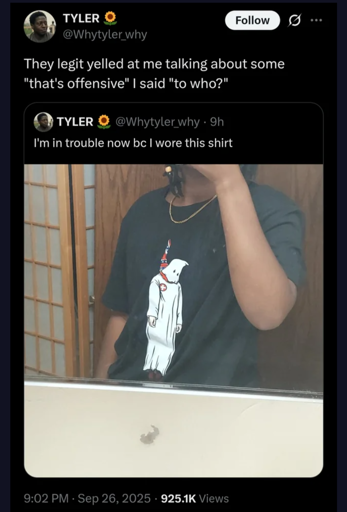 Take your own advice and stop crying on the internet over depictions of a dead cartoon Klansman t shirt and go back to the Charlie Kirk memorial where you came from.