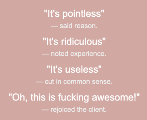 I am still very much pissed off by one of these shit proposals client brought in a couple months ago. Utter garbage, absolutely useless, serves no purpose but to make the design more complicated, increase server load, costs, etc which I just told then straight to their face in the first meeting. But no, The all mighty, all knowledgeable client had to smear that shit on the wall and have 5 different meetings and feasibility checks to come to the same conclusion I gave them after hearing their fart in a jar. Fuck these idiotic assholes.