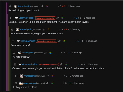 Got a 7 day ban on !memes@lemmy.ml after responding to this very abusive commenter with this image:
