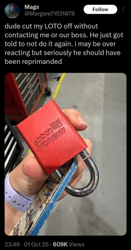 Fuck with my LOTO and I’m gonna try to get you booted from my jobsite. That’s a pissing contest worth pursuing.