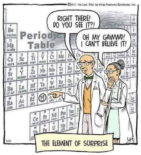 I’m not sure why it bothers me that they didn’t use the actual periodic table and replace one element for the joke. Instead it’s all jumbled and misnumbered.