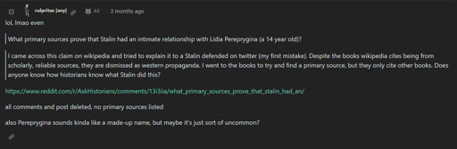 goat@sh.itjust.worksM to MeanwhileOnGrad@sh.itjust.worksEnglish · 2 days agoTankies don't think Lidia Pereprygina, Stalin's 13-year-old lover, is a real personsh.itjust.worksimagemessage-square7fedilinkarrow-up143