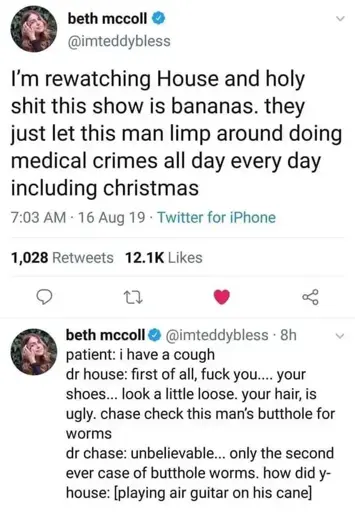 Yeah the cases were fun and formulaic, but my favorite parts were seeing the moments House was confronted with his mental health. The guy cared a lot and had no idea how to deal with it.