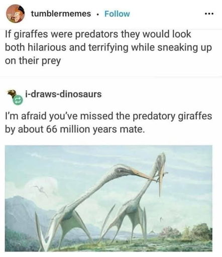 fossilesque@mander.xyzM to Science Memes@mander.xyzEnglish · 1 month agopredatory giraffesmander.xyzimagemessage-square36fedilinkarrow-up1627