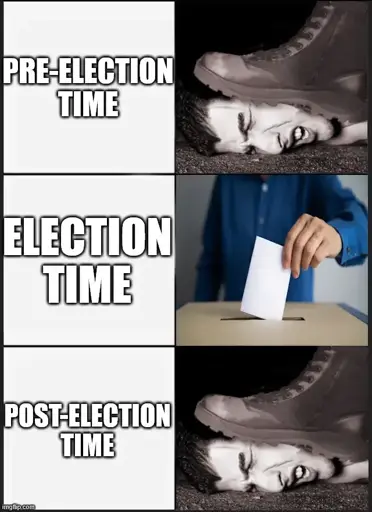 “Don’t bother voting! Your only solution is full on revolution!” revolution does not happen “Oh shit, he got in again”