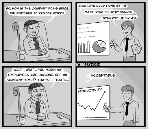 It all comes down to money. Frankly they wouldn’t care if you jacked off all the time if they were making enough money. The problem comes down to most of these companies have massive commercial real estate investments that cost them more than the monetary gains they’re getting from a more productive staff, so they’re focusing on that. You’ll notice that the companies that are successfully doing remote have sold off their buildings or don’t have any leases anymore.