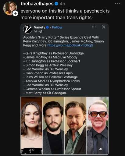 not sure most cis people are aware of the association between JK Rowling, Harry Potter, and her transphobia… maybe the cast and crew are aware and choosing a paycheck over association with a known transphobe, but I don’t think it’s as guaranteed as it may seem to us