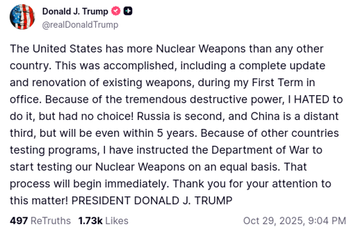 Are we at least not doing above-ground testing and burying it to minimize the contamination of various elements which taint scientific study for no good reason? Or are we back to big spectacular above-ground, air-burst or at sea-level type testing because it looks cooler. Oh who am I kidding, Trump will want it above-ground and probably in the Pacific or something to saber rattle at China with and will say it was the biggest and bestest nukulur explosion ever.