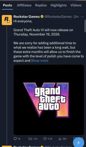 Awoo [she/her]@hexbear.net to Games@hexbear.netEnglish · 3 days agoGTA 6 has been delayed again, this time until November 19 2026hexbear.netimagemessage-square59fedilinkarrow-up187