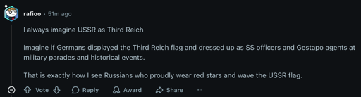 Imagine if Germans displayed the third Reich flag and dressed up as SS officers and gestapo agents at military parades and historical events
