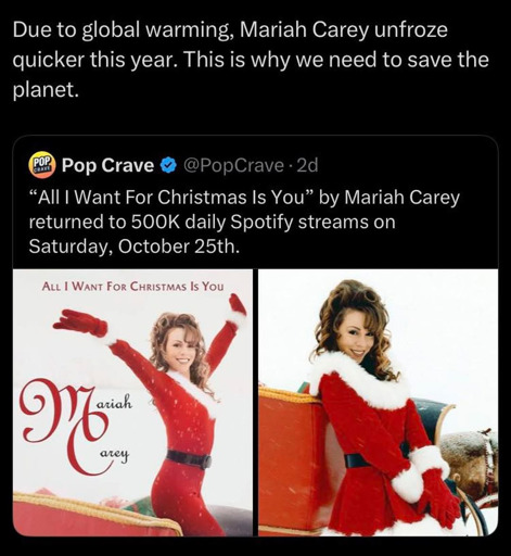 This is hilarious and terrifying at the same time. The artist behind “All I Want For Christmas Is You” hitting big streams in October is funny, but the punchline about global warming actually stings. Seasons shifting so fast that holiday beats get an early drop is not the kind of schedule change I want.
