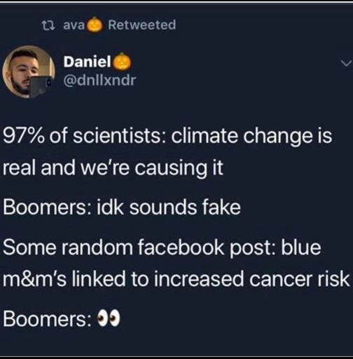 minus-squareprotist@mander.xyzlinkfedilinkEnglisharrow-up75·3 days agoClimate change is real and we’re causing it “I definitely did not do this and won’t change anything I do.” Blue M&Ms cause cancer “How could the M&M people do this to me?”