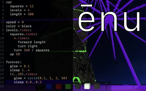 Enu is based on the belief that text based programming can be accessible to kids if made simple enough, and that text is more flexible than visual programming using tools like Scratch and Game Builder Garage. I still have lots of work to do to improve discoverability, but based on my experience using it to run a coding club and teaching my own children, I believe the theory mostly holds. It’s inspired by Logo and Minecraft, has a terse syntax for building nested state machines (although it calls them Command Loops), and tries to make it possible to build full games using only simple concepts like loops and conditionals.
