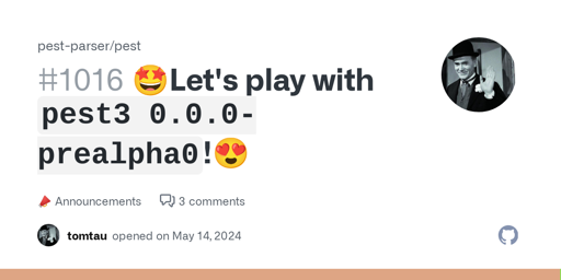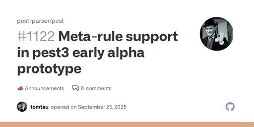 tomtau@aussie.zone to Rust Programming@lemmy.ml · 17 days agoMeta-rule support in pest3 early alpha prototypeplus-squaregithub.comexternal-linkmessage-square2fedilinkarrow-up19
